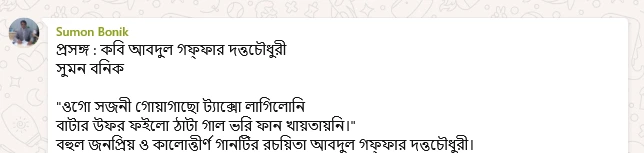 আবদুল গফ্ফার দত্তচৌধুরীর গুয়া গাছো ট্যাক্সো লাগিলোনি গানটির ব্যাপারে অনেক শুনেছি। অত্যাচারী ইংরেজ সরকার রাজস্ব আদায়ে করের হার অযৌক্তিক বাড়িয়ে দিয়েছিল। মানুষের দৈনন্দিন জীবনে চাপ তীব্র হয় তখন। এর প্রতিবাদে সম্ভবত গানটি লিখেছিলেন তিনি। ইংরেজ খেদাও আন্দোলনে তাঁর সম্পৃক্ততার ব্যাপারে অবশ্য আমার কোনো ধারণাই নেই! তিনি-যে বংশধারায় গুরুসদয় দত্তের সঙ্গে সম্পর্কিত,—এই খবরটিও জানা ছিল না। সনেট ও গান লিখতেন;—এটুকু জানতাম কেবল! সময়-সুযোগ করে তাঁকে পাঠ করার অবকাশ জোটেনি। এখন একথা ভেবে গ্লানি জাগছে মনে।