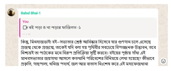 কিন্তু, মিনহাজভাই! বই—সভ্যতার শ্রেষ্ঠ আবিষ্কার হিসেবে যার গুণগান চলে এসেছে প্রজন্ম থেকে প্রজন্মে, তাকেই যদি বলা হয় পৃথিবীর সবচেয়ে বিপজ্জনক উদ্ভাবন, তবে নিশ্চয়ই তা পাঠকের মনে বিরূপ প্রতিক্রিয়া সৃষ্টি করবে। বইয়ের পৃষ্ঠায় গাঁথা এই মানবসভ্যতার জয়গাথা আসলে কতখানি পরিবেশের বিনিময়ে লেখা হয়েছে? কীভাবে প্রকৃতি, গাছপালা, খনিজ পদার্থ, জল আর বাতাস নিঃশেষ করে এই মহাফেজখানা গড়ে তোলা হয়েছে—সেই প্রশ্নটিই এখানে মূল।