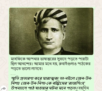 মাখফিকে আপনার ভাষান্তরের সুবাদে পড়তে পারা ছিল আনন্দের। আমার মনে হয়, রুবাইগুলাও পাঠকের পড়তে ভালো লাগবে। স্মৃতি প্রতারণা করে মারাত্মক! তা-নইলে জেন-উন-নিশা/জেব-উন-নিসা-কে বঙ্কিমের ‘রাজসিংহ’ উপন্যাসে পাঠ যাওয়ার ঘটনা মনে পড়ত। বহুদিন আগে পাঠ করার দোষে স্মৃতি থেকে সবটুকু মুছে গিয়েছিল। আওরঙ্গজেব-দুহিতা সেখানে ‘জেব-উন্নিসা’ নামে চিত্রিত হয়েছেন। নেটে ‘রাজসিংহ’ উপন্যাসে এতোদিন পর চোখ বোলাতে যেয়ে বঙ্কিম এভাবেই লিখেছেন দেখতে পাচ্ছি।