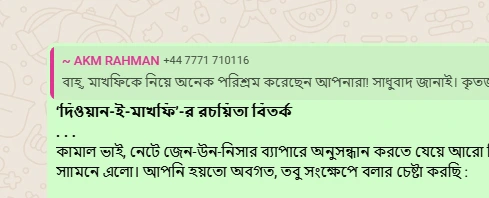 আমার কাছে মনে হয়েছে যে-কয়েক হাজার দিওয়ান থেকে যে-চারশো বিশটি দিওয়ান মাখফির বলে উদ্ধার করা হয়েছিল, সেসবের মধ্যে একটা সুরসংগতি আছে। যেভাবেই দেখি না কেন পোয়েটিক ডিকশন পুরুষ ও নারী কবির অবশ্যই ভিন্ন। ফার্সি ভাষার লক্ষ-লক্ষ দিওয়ান হতে মাখফির বলে যারা ঐসব উদ্ধার করেছিলেন, তারা ফার্সি ভাষার বিশেষজ্ঞ। যাহোক, শেক্সপিয়ারের রচনা নিয়েও মতভেদ রয়েছে। আপনার পর্যবেক্ষণ চমকপ্রদ। ভাবতেও পারিনি এতটা মনোযোগ মাখফি পাবে।
