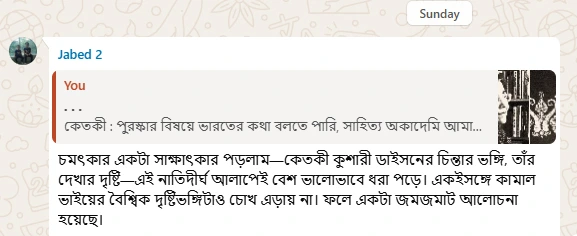 কামাল ভাই ও মারুফ রায়হানের সঙ্গে কেতকী কুশারী ডাইসনের আলাপটি প্রসঙ্গ-অনুষঙ্গে ঠাসা জাভেদ। থার্ড লেন স্পেস-এ তোলার সময় আমার খেই হারানোর অবস্থা দাঁড়িয়েছিল। যদিও এই খেই হারানোকে বিরক্তিকর বলাটা অবশ্যই ভুল হবে। আলাপের ভিতরে ফোর্স কাজ করেছে আগাগোড়া, যা আপনাকে টেনে নিতে থাকে।