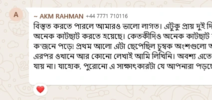 বিস্তৃত করতে পারলে আমারও ভালো লাগত। এটুকু প্রায় দুই দিনের ফসল। আমাকেও অনেক কাটছাট করতে হয়েছে। কেতকীদিও অনেক কাটছাট করেন। তবে একটুও বা ক’জনে পড়ে! প্রথম আলো এটা ছেপেছিল চুম্বক অংশগুলো আবার কাটছাট করে। এরপর ওখানে আর কোনো লেখাই আমি লিখিনি। অবশ্য এতে ওদের কিছুই আসে যায় না। যাহোক, পুরোনো এ সাক্ষাৎকারটা-যে আপনারা পড়ছেন এজন্য কৃতজ্ঞতা।