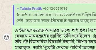 গ্যাসপারের এন্টার দ্য ভয়েড ভালোই লেগেছিল। কিন্তু, অনেক আগের স্মৃতি; কিছুই মনে নেই। তবে তার ‘লাভ’ সিনেমাটা আমার ভালো লেগেছিল, অন্তত যে-আইডিয়াটা কোনোট করতে চেয়েছিল; তবে অতিরিক্ত পোর্ট্রে করে ফেলেছিল, যেমনটা করে আর-কী সবসময়।