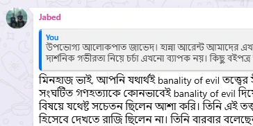 আমাদের প্রেক্ষাপটে হানা আরেন্টের প্রাসঙ্গিকতা আপনার ব্যাখ্যায় সবিস্তারে উঠে এসেছে জাভেদ। মূল লেখায় আপনি আমাদের সাম্প্রতিক পরিস্থিতিতে হানার প্রাসঙ্গিকতাকে কেবল ছুঁয়ে গিয়েছিলেন। ব্যানালিটি অব ইভিলের পাশাপাশি একনায়কতন্ত্র কায়েমের রসদ আইডিওলজি অ্যান্ড টেরর, প্রসঙ্গটি উঠে আসায়, তা এখন পূর্ণতা পেল। নাজিবাদে নিহিত সন্ত্রাসকে যদি খতিয়ে দেখি, তাহলে দেখব, সেখানে এটি তখন ধর্মীয় বিশ্বাসের মতো শক্তিশালী মারণাস্ত্রে পরিণত হয়েছিল। হিটলার উচ্চমাত্রার মেধাবী ও ক্যারিশম্যাটিক লোক ছিলেন;—এই ব্যাপারে কোনো সন্দেহ নেই। নিটশের উবারম্যানশ বা অতিমানবের দার্শনিক প্রতিমাকে তিনি নিজ মাপে কাটছাট করে নিলেন সেইসময়।