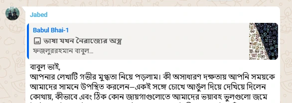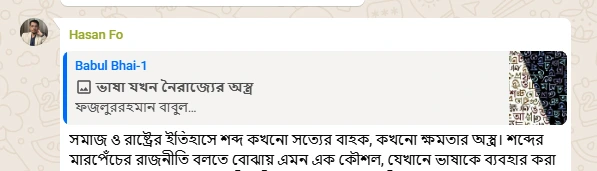 বাবুল ভাই এমন একটি দিক তুলে এনেছেন তার লেখায়, যেটি নিয়ে গভীরে গিয়ে আলাপ আমার তেমন একটা চোখে পড়েনি। গ্রুপে আমরা গণমাধ্যম কীভাবে ভাষাকে ম্যানিপুলেট করে মিথ্যা তৈরি করে ইত্যাদি নিয়ে আলাপ করেছি, বিশেষ করে চব্বিশের পটপরিবর্তনের পরে, কিন্তু বাবুল ভাইয়ের এইটা আরো গভীরে গিয়ে ভাবার বিষয়।
