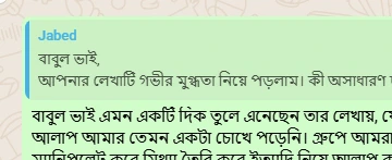 বাবুল ভাই, আপনার লেখাটি গভীর মুগ্ধতা নিয়ে পড়লাম। কী অসাধারণ দক্ষতায় আপনি সময়কে আমাদের সামনে উপস্থিত করলেন! একইসঙ্গে চোখে আঙুল দিয়ে দেখিয়ে দিলেন কোথায়, কীভাবে এবং ঠিক কোন জায়গাগুলোতে আমাদের ভয়াবহ ভুলগুলো জমে উঠেছে। এই হোয়াটসঅ্যাপ গ্রুপ গঠনের শুরু থেকে মিনহাজ ভাই তাঁর একের-পর-এক লেখায়, আপনি নিজে ও গ্রুপের আরও অনেকে যে-অশুভ ভবিষ্যতের কথা বলে আসছিলেন,—আজ সেটি যেন পূর্ণাঙ্গ রূপ নিয়ে আমাদের সামনে হাজির হয়েছে।