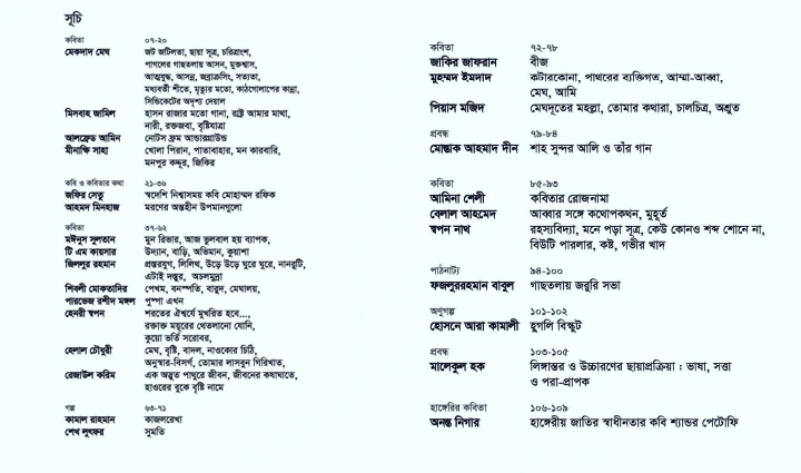 এই সংখ্যায় রাখা থাকল কবি, কবিতা, গান ও তার রচয়িতা নিয়ে কিছু কথা, রাখা থাকলো প্রবন্ধ—যাতে যুক্তি ও নন্দনের দ্বন্দ্বে জেগে ওঠে সত্যের সুর…বাক্য। আর, গল্প ও অনুগল্পেও আছে দৈনন্দিনের ধূসর আলো—জীবনের লুকানো রসায়ন; আছে কিঞ্চিৎ অনুবাদ; আছে একখানি পাঠনাট্য—যা মঞ্চের বাইরে থেকেও পাঠকের অন্তরে একটা আলো জ্বালাতে কিংবা প্রশ্ন তুলতে পারে।